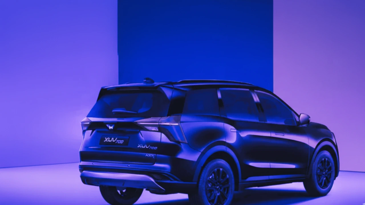 Rear view of a dark blue Mahindra XUV700 Facelift, highlighting its updated design elements under purple and blue lighting, hinting at future hybrid possibilities.